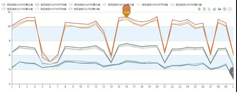 1、諧波電壓含量高達11.31%,遠(yuǎn)超國标5樂煙%限值,諧波電流含量高達為(wèi)73%。